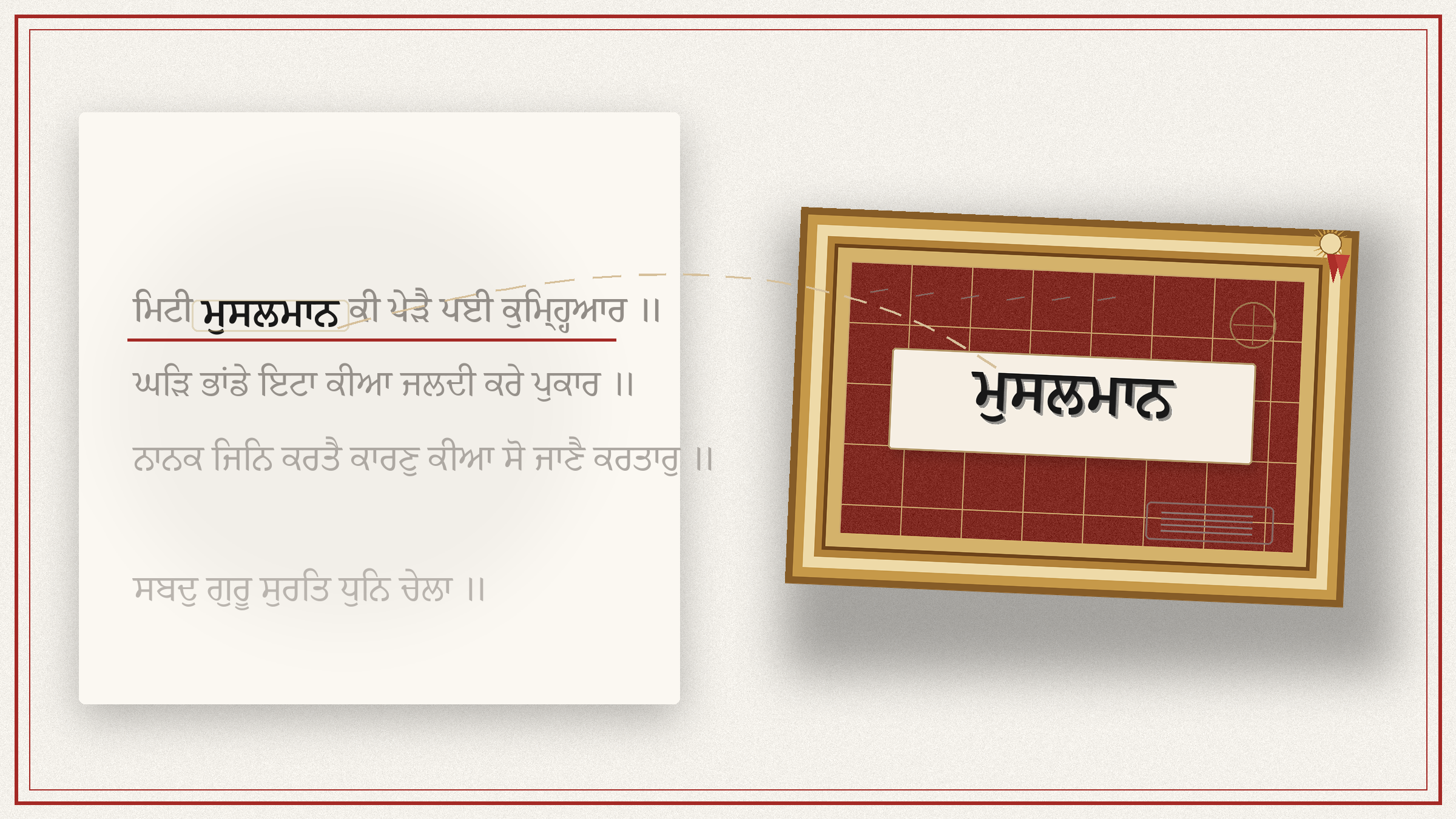 But under imperial pressure, according to the standard Sikh account reflected in Britannica, Ram Rai did not hold the line as it stood. He tried to make the line acceptable to the court by saying it had been wrongly transmitted. Sikh tradition holds that the specific change was from "musalmaan" to "beimaan" — from "Muslim" to "faithless" — a single word altered to remove the offence to the court. Whether one emphasises fear, youth, court pressure, or strategy, the result is the same: a word in Gurbani was made to answer to power rather than to the Guru.